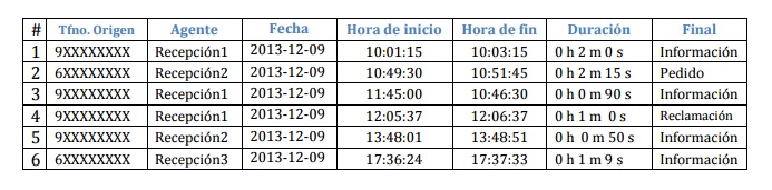 De todas las llamadas registradas, se podrá obtener un informe detallado del número llamadas gestionadas, filtrar los resultados obtenidos por horarios, días/semanas/meses, duración de las llamadas, resultado final,… Estos datos son exportables, por ejemplo, a soporte Excel.